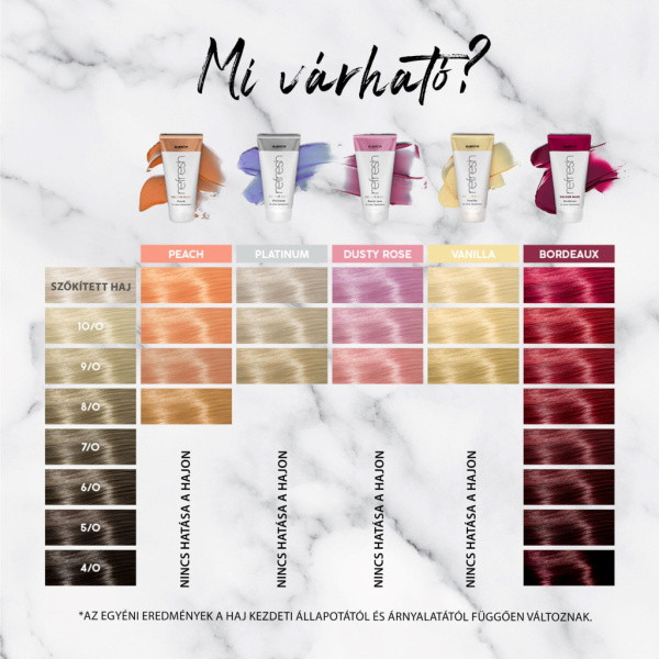A nem tartós pigmenteket tartalmazó tápláló maszk célja, hogy frissítse a meglévő színt, vagy kísérletezhetünk olyan divatos árnyalatokkal is, amelyek eltűnnek 3-5 hajmosás után. A mélyen tápláló maszk kókuszolajat és mangóvajat tartalmaz, melyek hidratálják a hajat, csökkentik a göndörödést, selymesen simává és fényessé teszik a hajat. Használat: Mossa meg és törölközővel alaposan törölje meg a hajat. Válassza részeire a hajat, vigyen fel bőséges mennyiséget a maszkból és fésülje át. Hagyja hatni 5-10 percig a kívánt szín intenzitástól függően. Alaposan öblítse le!